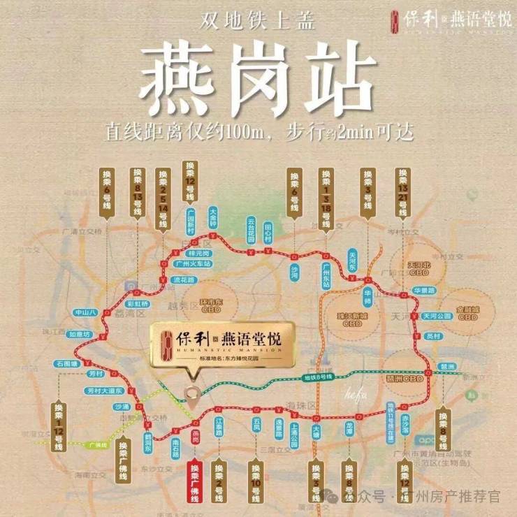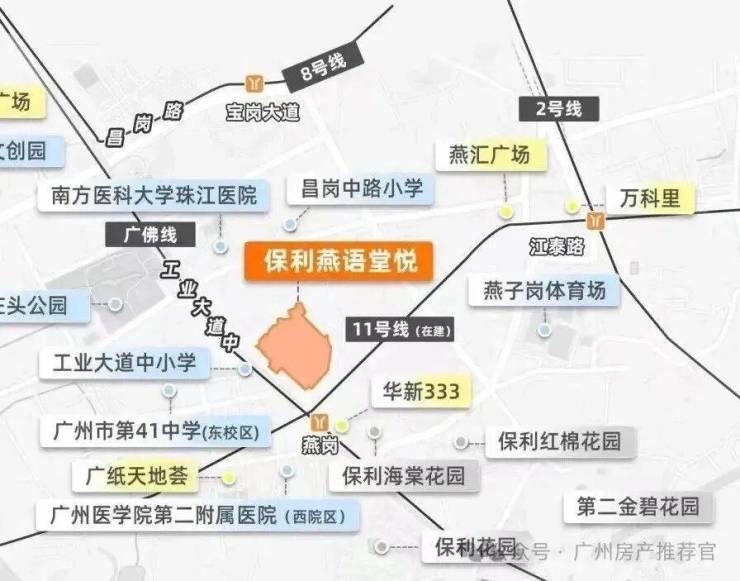 交通:保利燕语堂悦的交通优势无可比拟。项目紧邻燕岗站,双地铁线路轻松链接全城,无论是前往琶洲、珠江新城还是其他繁华商圈,都极为便捷。此外,项目周边交通路网发达,紧邻工业大道主干道,驱车可快速到达广州各大核心区域。