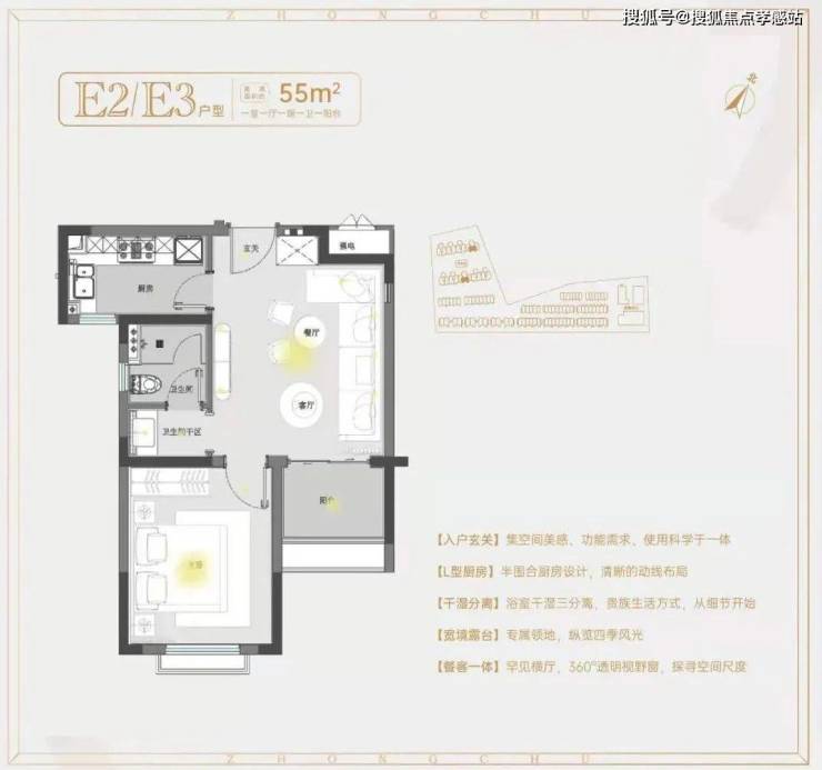 建面约55㎡1房1卫户型,低总价优质上车小户型,做到了双开间朝南+卫生间干湿分离+卧室带飘窗+客餐厅相连,小而美的一个户型。