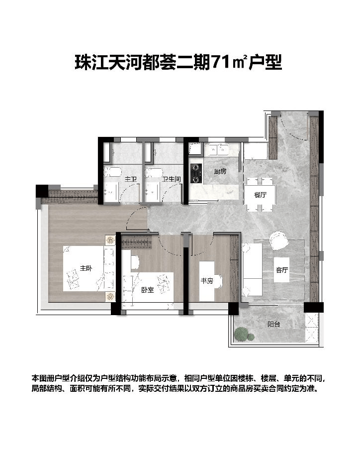 在天河新房普遍500万起步的当下,天河都荟72㎡三房两卫以300万出头的总价成为“刚需福音”。户型采用罕见的四开间朝南设计,阳光可穿透每个房间,主卧270°L型飘窗不仅拓展视野,更可改造为独立书房或婴儿房,实现“小面积大功能”的居住升级。实际使用面积堪比90㎡的空间魔术,让首次置业者告别“牺牲房间换地段”的无奈。