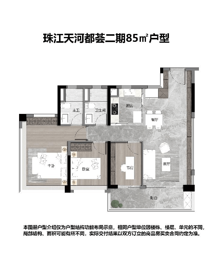 85㎡户型将“社交型居住”理念演绎到极致,6米南向阳台如同空中花园,连接42㎡LDKB一体化空间(客厅、餐厅、厨房、阳台),形成开放式“家庭秀场”。这种打破传统隔断的设计,让烹饪、用餐、娱乐在同一视野下完成,孩子在客厅玩耍时家长可随时照看。主卧套间带全景飘窗,独立卫浴满足私密性,二孩家庭的成长需求在此得到完美适配,空间尺度堪比市面上100㎡户型。