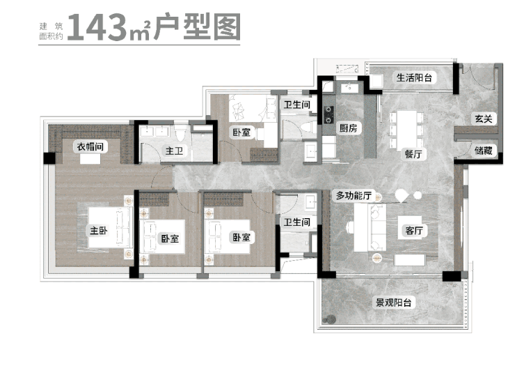 建面约142-143㎡户型:直接配置双套房+三卫生间,完美解决三代同堂或多孩家庭的居住需求。