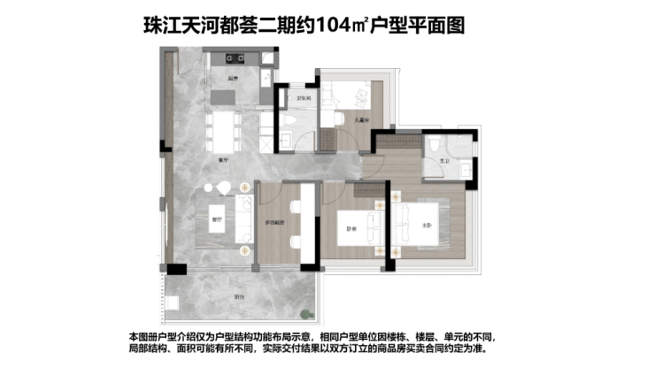 其中,建面约104㎡户型:不仅做到零浪费,更以南向四开间、约14米面宽的设计,让卧室、客厅等所有功能区都能直面阳光。再搭配约6.1米景观阳台,将社区园林风光最大化引入室内,景观无敌。