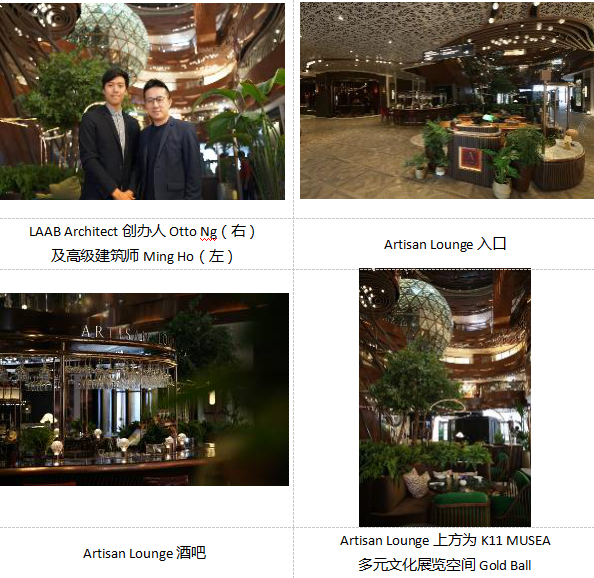 位处K11 MUSEA中庭「Opera Theatre」核心的Artisan Lounge,于其上方的多元文化展览空间Gold Ball的灯光折射映照下,创意灵感无限展现,彰显「文化硅谷」的箇中理念,由100 Creative Powers之一的本地80后建筑设计事务所LAAB Architect负责设计。LAAB的创办人吴镇麟(Otto)为本地新晋创意建筑设计师,毕业于美国麻省理工大学,擅长以科技、机械、自然融入建筑设计,如梳士巴利花园的「茅室」厕所及星光大道的机械式开合海边档等。