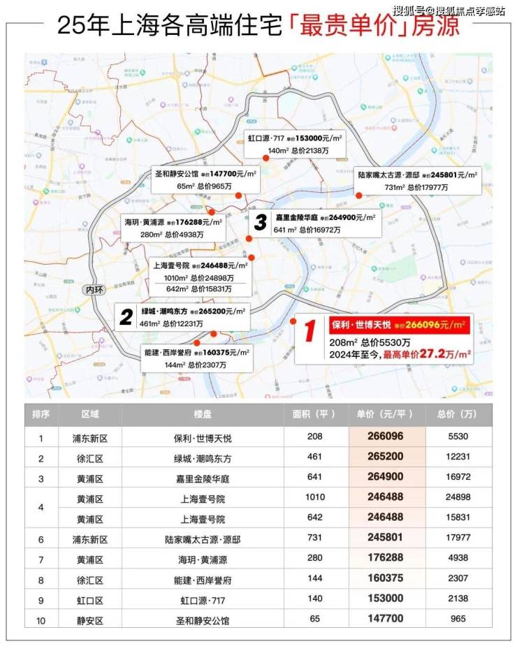 一线滨江世博板块的保利世博天悦(26.6万/m²)拔得头筹,成为2025年上海豪宅市场的新晋王!