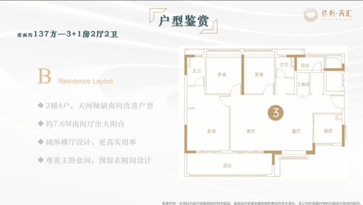 保利天汇位于广州市天河区大观中路120号,坐落在天河智谷板块,占地30万㎡,总建筑面积78万㎡,容积率4.59,绿化率23%。项目规划16栋住宅,分五期开发,涵盖高端住宅、商业、写字楼、酒店公寓等多业态产品。当前在售五期,主推99-131㎡三至四房精装户型,总户数约1790户,车位比1:1.33,为改善型买家提供丰富选择。