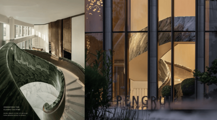售楼处和会所是CCD做的。两层挑高,旋转楼梯两面是Prada绿的石材延续上去的。