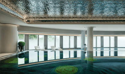 泳池用梵高星空做马赛克池底,做在2F的无边泳池,天光洒进来,还有按摩池和儿童戏水池。