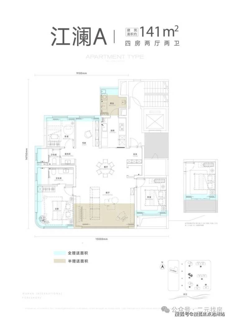 ①3号楼,141㎡户型(四房两厅两卫),得房率约95%;