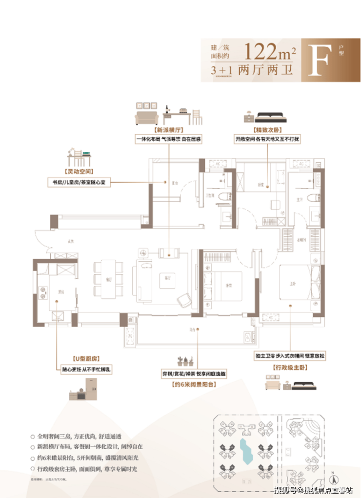 F户型:建面约122㎡ 3+1房两厅两卫