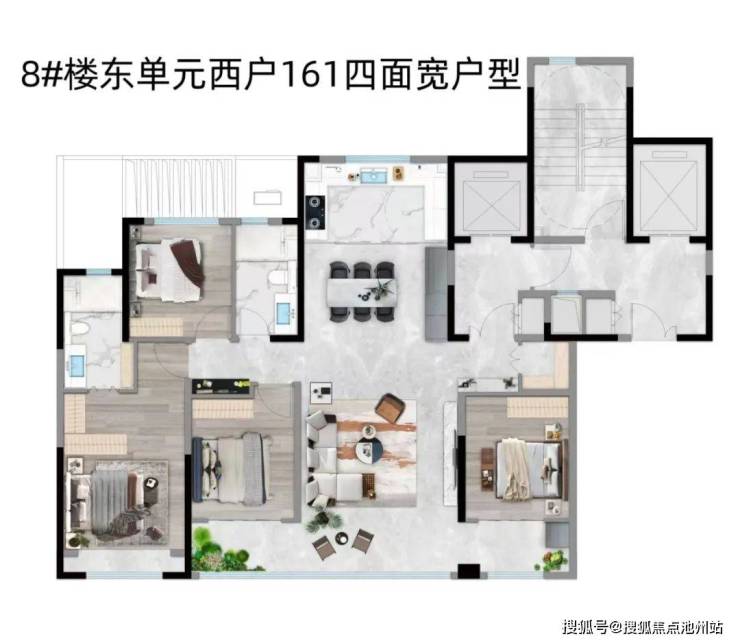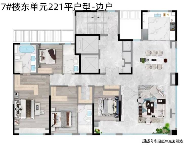 如果大家仔细看户型图就会发现,全部都是独立电梯厅,且有北侧大面积设备平台赠送,每个户型都有大面积的赠送空间得房率非常高。