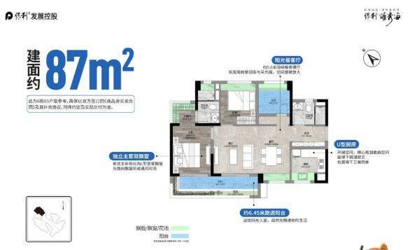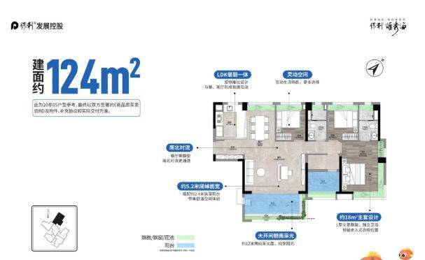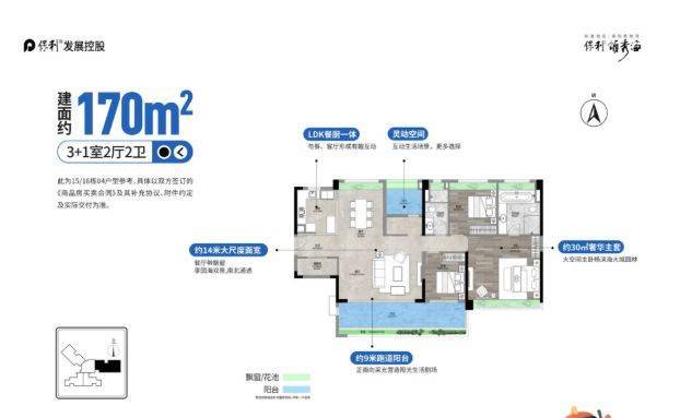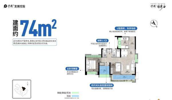 保利领秀海推出一期74-170平方米三到四房以及二期63-82平方米三房户型,所有户型均通过巧妙设计实现高实用率,最高可达107%。具体户型如下: