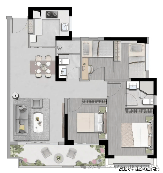 99㎡三+1房户型,约6.5米南向宽景阳台,环幕视野;
