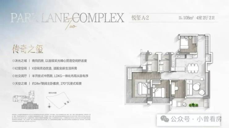 面积段:108-300㎡全南向四房,最小108㎡做到四房,实用率95%;