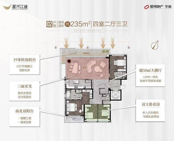 项目共有7栋楼,全部采用半围合式纯板式设计,最小面积为179平方米,最大面积为235平方米,均为双套房设计。其中,5栋的235平方米户型距离江边仅90米左右,是项目主推户型,货量最少,只有30套。产品本身亮点十足:LOW-E玻璃、LDKB一体化、超宽大阳台、双主卧套间、高得房率、三卫浴空间等,均彰显出项目的高端定位。