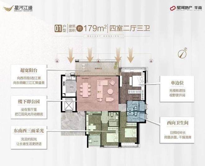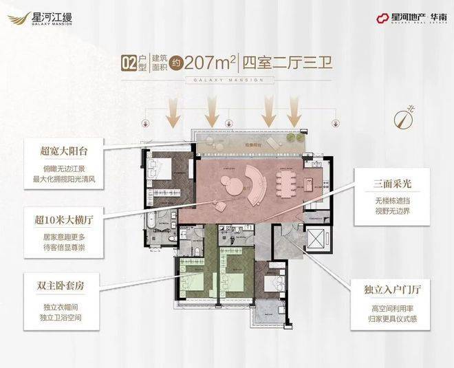 星河江缦由星河地产开发,占地面积60203平方米,总建筑面积72403平方米,容积率为3.53,绿化率高达35%。项目共规划了324户,主力户型为179-235平方米的大平层,每户均配备了专梯专户,确保住户的私密性和尊贵体验。