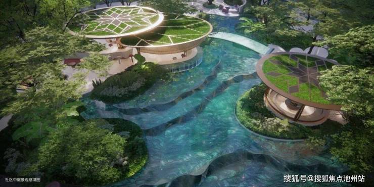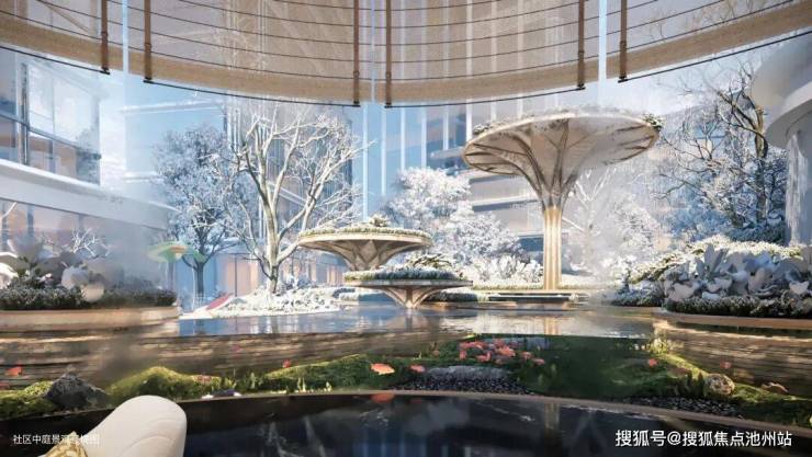 4、中庭水景移植九寨黄龙彩池奇观,占比超20%、整体约2200㎡的水景规模在武汉开创先河。水在中国文化中象征财智与流动生机,这一方既具自然野趣、又涵容艺术美感的空间,在别处难得一见。