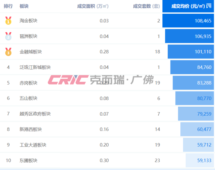 板块表现方面,克而瑞数据监测显示,9月前半月(截至15日)剔除掉13个无网签记录的板块后,全市共有70个板块录得网签,单价10万+/㎡板块数量有3个, 较上月增长3个,高于全市板块均价数量有29个,最高为淘金板块,成交均价108465元/㎡。