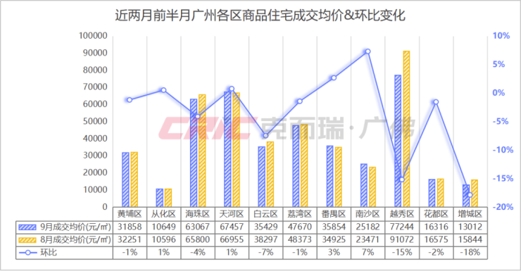 在成交均价上,克而瑞数据监测显示,9月前半月(截至15日)广州商品住宅成交均价31493元/㎡,较8月前半月(截至15日)基本持平。