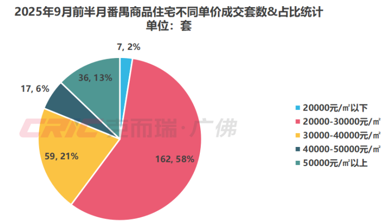 番禺9月前半月(截至15日)商品住宅成交均价35854元/㎡,环比8月前半月(截至15日)结构性上涨3%,主要得益于高价项目成交占比的扩大带动了区域网签均价的上涨,单价5万元/㎡以上商品住宅网签36套,占比13%,环比8月前半月(截至15日)扩大6%,成交主力来自长隆万博悦府。