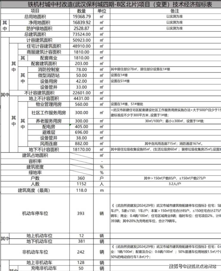 湖北保利置业保利城四期-B区保利琅誉北片项目变更后规划总用地面积19368.79㎡,净用地面积16839.92㎡,防护绿地面积2528.87㎡。总建筑面积73524.00㎡,计容建筑面积50923.00㎡,住宅计容建筑面积48910.00㎡,商服建筑计容面积1810.00㎡。不计容建筑面积22601.00㎡,风雨连廊882.00㎡,地下不计容面积18170.00㎡。户数360户,人数1152人,建筑高度118.0米。机动车停车位393个(含充电桩车位79个),非机动车停车位242个。
