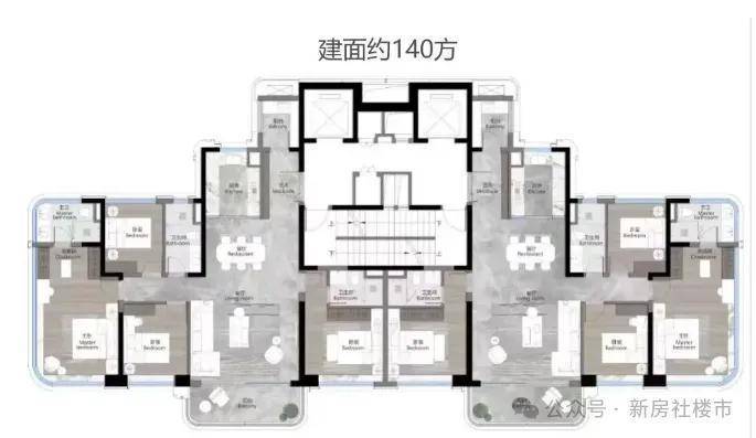 • 140㎡四房三卫:双主套设计,南北通透,南向采光面约15.8米,空间感媲美二手市场200㎡产品。