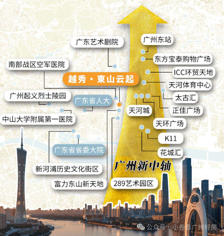 東山云起,与珠江新城仅一路之隔,集齐了广州最强GDP组合,越秀区+天河区;百年东山+珠城心脏+新中轴精华配套。珠江新城,是华南第一CBD,广州头部豪宅,近8成在珠江新城。