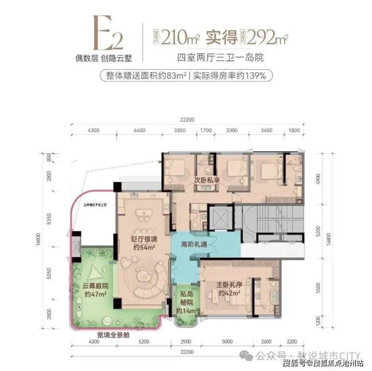 尤其是主卧旁的私密岛院,面积做到了约14㎡。