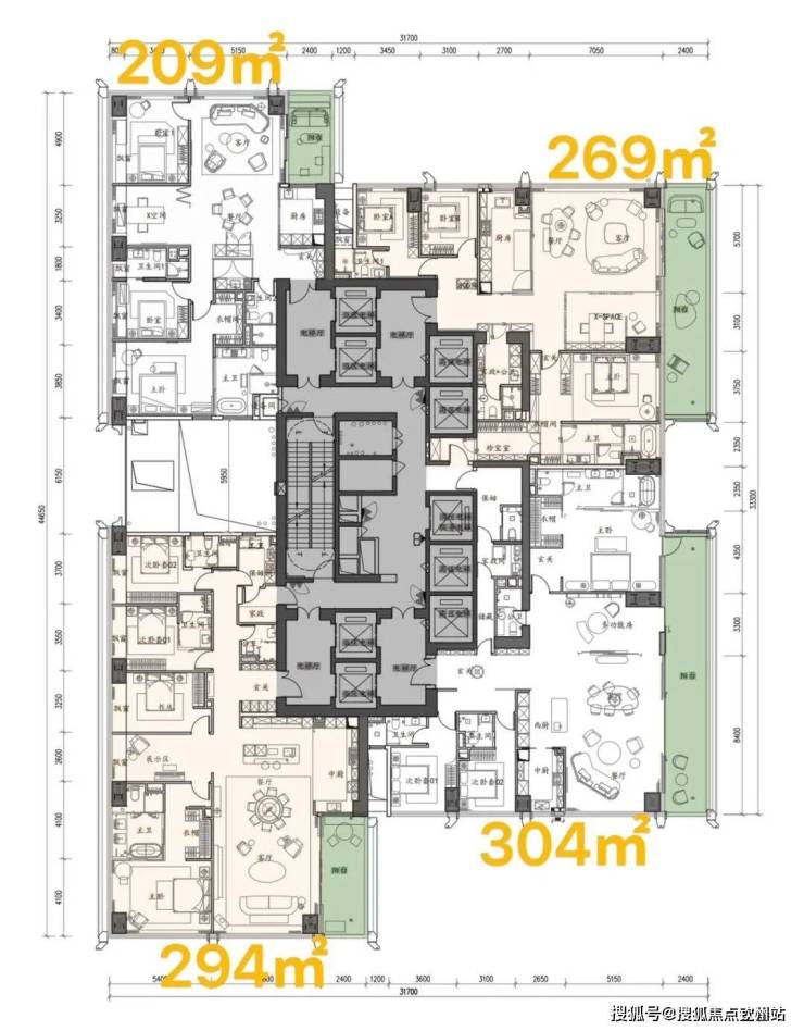 项目容积率7.59,限高250米,规划5栋超高层住宅,采用全玻璃幕墙设计,实用率高达92%以上,主力户型200㎡以上大平层,住宅约506套。