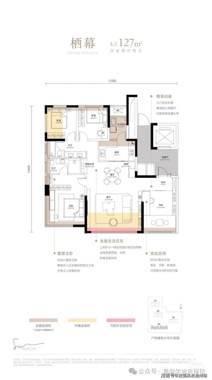 127户型独立电梯厅入户,LDKB一体化布局,客厅连着阳台,相当于周边三代宅花同样的钱多出一间房,主卧带衣帽间和飘窗,约13㎡灵活空间可以打造成书房或儿童房,127平能做到4房功能性拉满。