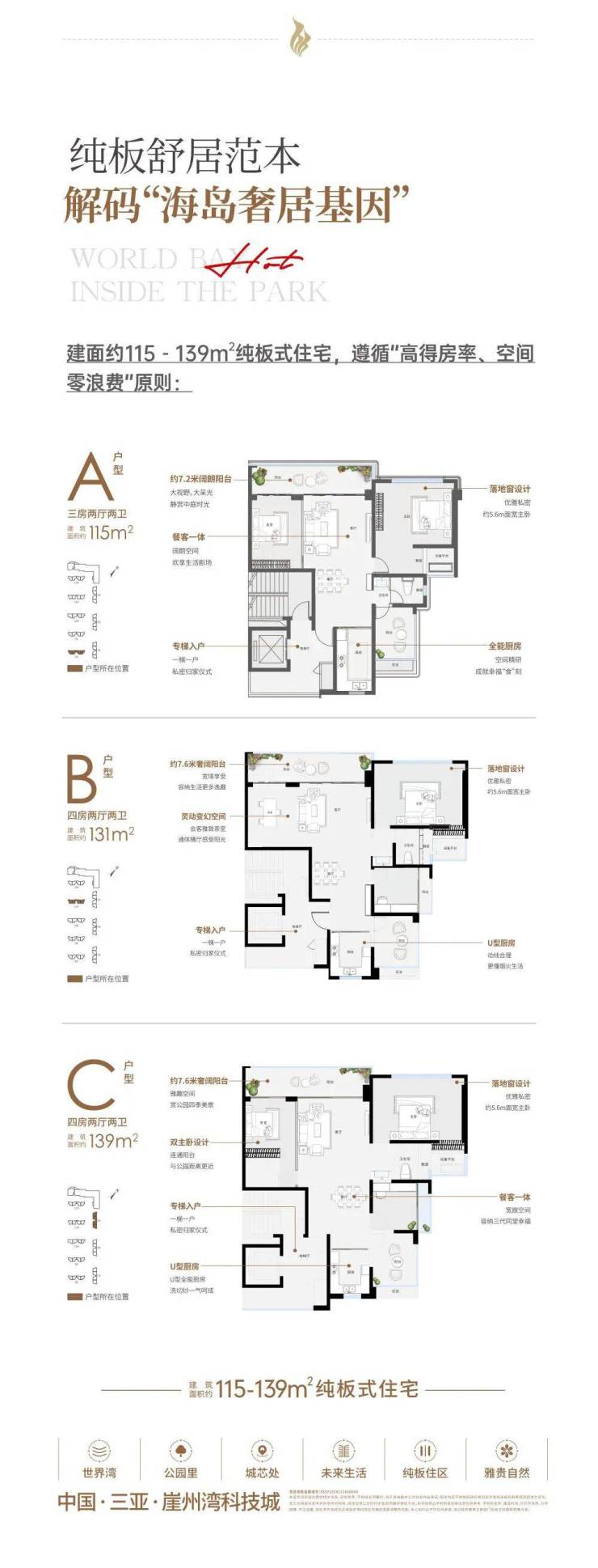 生态圈:生态宜居 活力舒居。观海公园、通海公园、滨海公园、滨河公园、中央公园、南繁公园、三角梅科博园七大公园景观环伺,环抱更多自然生活逸趣,出门即遇自然美景。