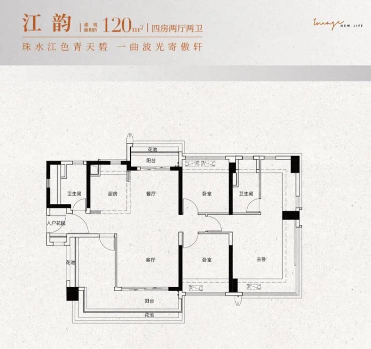 建面约120㎡:四房两厅两卫设计,共有2个户型可选,四开间朝南,居住与生活动静分离,南向大阳台或南北双阳台,主卧带270°飘窗