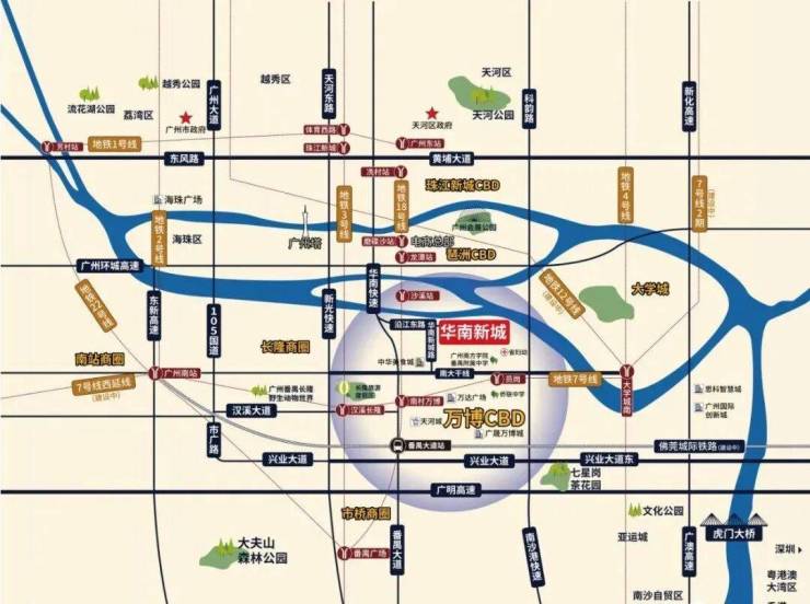 华南新城位于番禺区北部,临江靠山,西临华南快线,东与大学城隔江相望,北临珠江,南面是兴南大道和万博CBD。同时合生系在周边仍有大量建设用地,正在分批开发,致力以华南新城为核心,打造华南板块城市居住群。