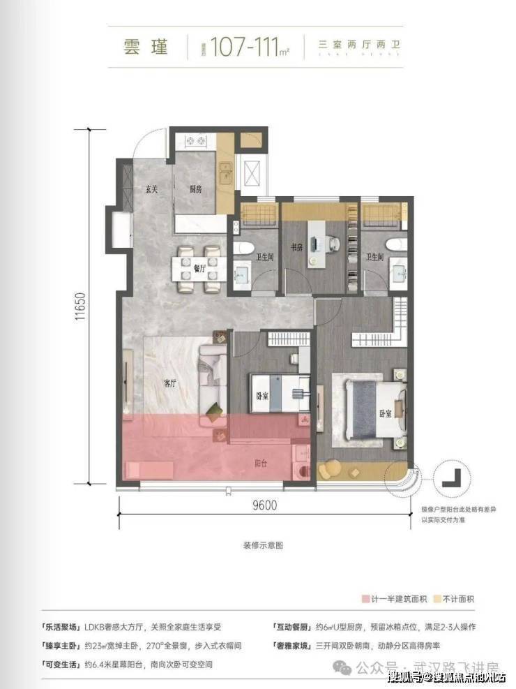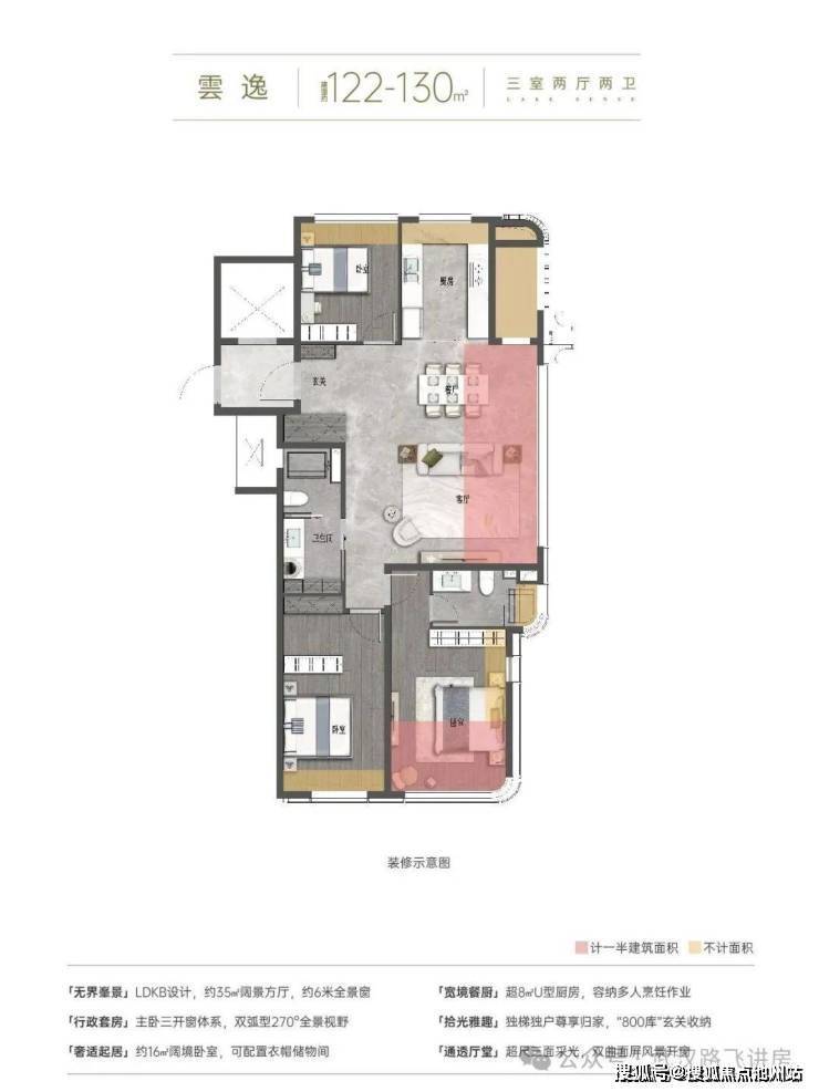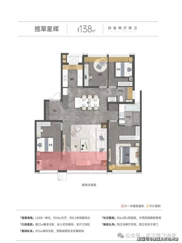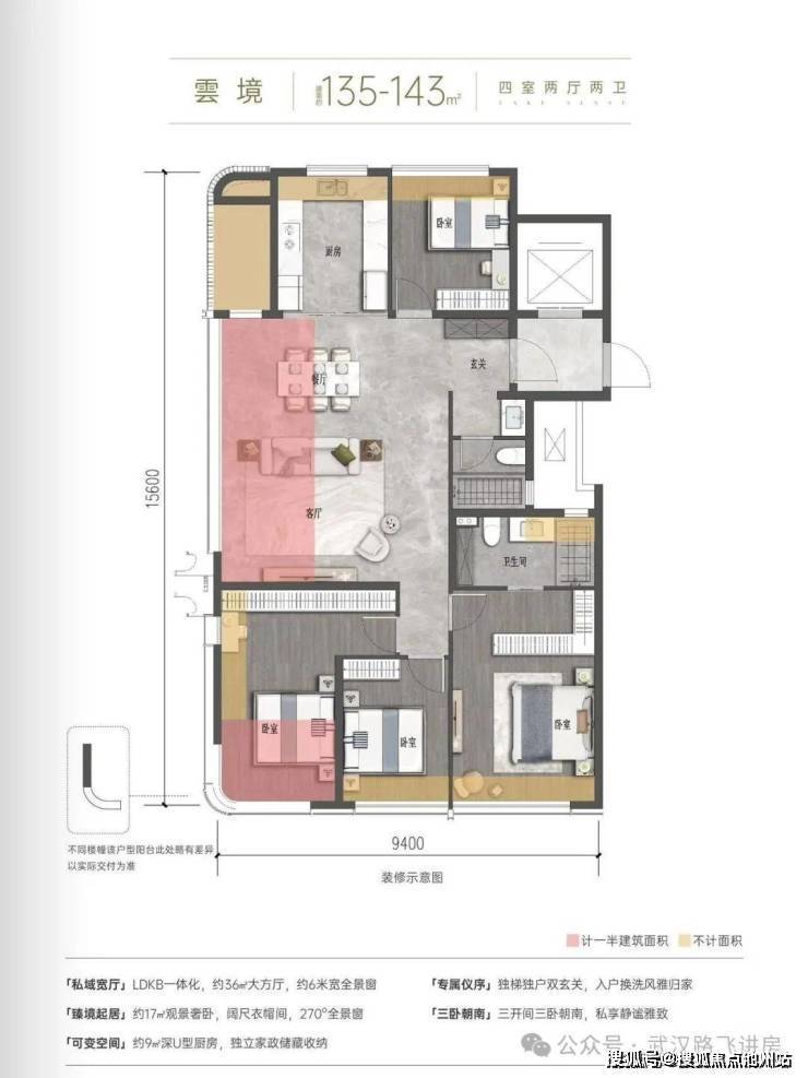 高层建面约111-143平房源,既有功能性三房两卫(建面约111平)、也有舒适性三房两卫(建面约127平)、功能性舒适性兼得的极致四房(建面约143平)更是绝绝子。