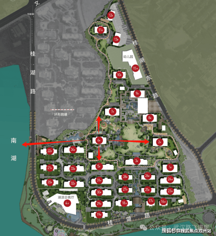 从地块来看,北面狭窄,南面比较方正。南面一线临湖以洋房为主,北面高层为主。而北面的1、3、5号楼为第一排高层,高层可以无遮挡看湖,湖景效果非常好。而6、7、10、11号楼可以西侧看南湖,8、9号楼相对看湖效果最弱。