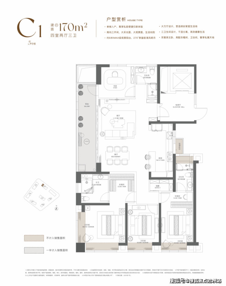 建面约170平,四房两厅三卫: