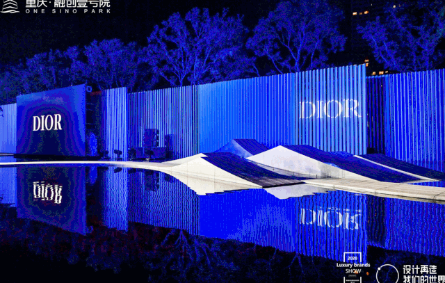 示范区里,“观澜”的一池清水里印着大大小小的圆形几何光影,水景与壹方艺术馆景墙上的“DIOR”LOGO字母演绎相映成趣。