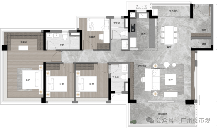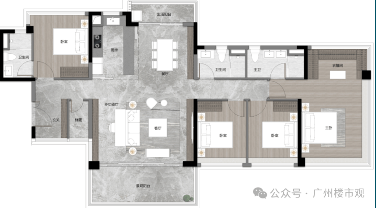 约142㎡和143㎡的户型设计更是诚意满满,直接配置了双套房和三个卫生间,无论是三代同堂还是多孩家庭,都能享受互不打扰的私密生活。