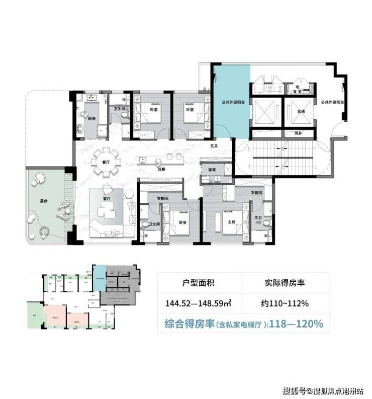 约120%综合得房率(含电梯厅)丨创新全赠送超大露台设计,突破得房率极限,实现最高120%的空间效能,让建筑空间真正为生活服务。