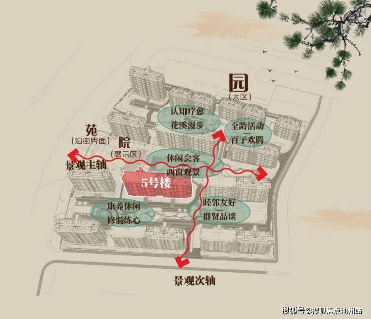 5号楼同时面向主入口中央景观轴线与次入口景观轴线。这一独特优势,意味着业主在家中可以欣赏到两种不同风格的绝美风景——主轴的仪式感与次轴的静谧感交织,形成丰富而立体的视觉体验,居家生活时刻与自然保持对话。