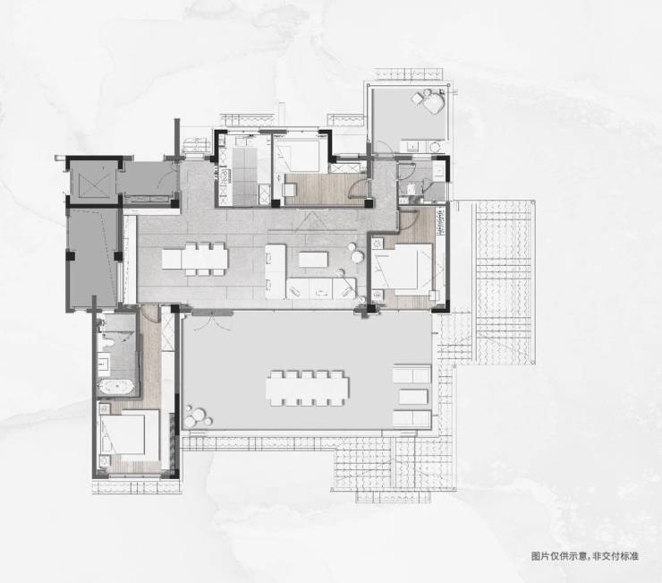 极致现代的错层外立面,向前延展的露台设计采用透光材质,充分考虑到两侧的采光需求。在层峦间收藏这部双厅舒轶的湖景洋房领衔作品。