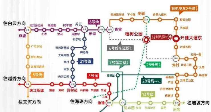 地铁6号线、21号线、有轨电车1号线均已开通,3条地铁线路、3条有轨电车规划建设中,双轨无缝接驳,实现半小时都市生活圈;三纵五横环城高速路网,每日高效行程。3纵-华南快速/开放大道/京港澳高速、5横-济广高速/开创大道/开泰大道/沈海高速/广园快速,多维路网密集铺排,全城高效通勤