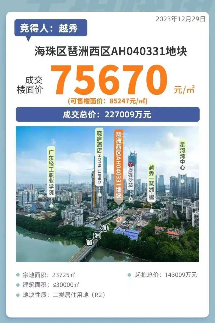 2023 年最后一个工作日,越秀地产广州区域成功拿下琶洲西区 AH040331 地块,折合楼面地价超 7.5 万 / 平,在全国地价排名中一度位列 TOP6。如今,该地块以 “琶洲・樾|华樾” 的正式案名亮相,由越秀地产和华发股份这两大国企携手开发。