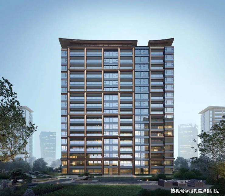 外立面诗意东方风格,具有识别性和独特性,主立面主要嵌以香槟色铝板斜切框套,造型细节更丰富,更凸显贵重感。