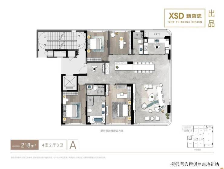建面约218㎡户型,同样是方正的四房设计。该户型采用动静分区式设计,既保障了私密性,也最大程度上将景观体验感拉满。
