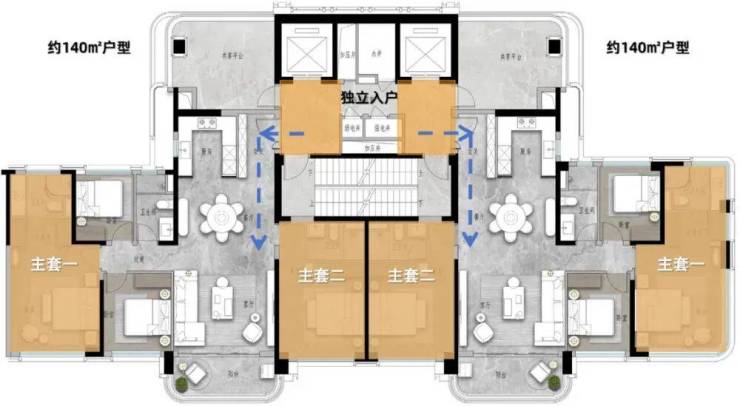 南地块采用2T2板楼设计,主打建面约120-210㎡户型,专梯专户,私密性极佳。楼间距最宽达74米,保障了充足的采光和通风。