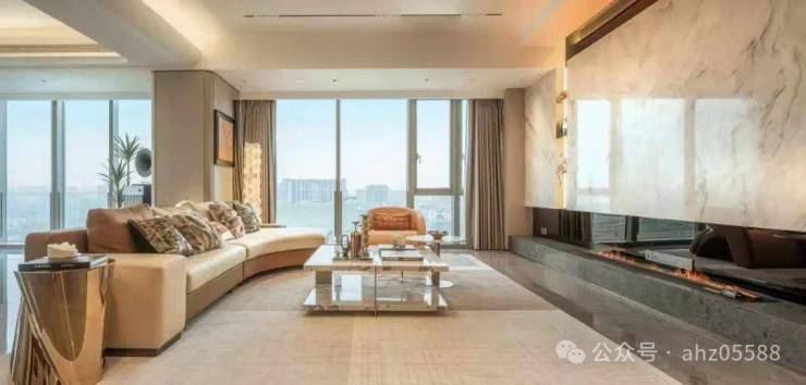 通铺的爱马仕灰石材质感高级、约5.1米的白金沙石材的客厅背景墙更是大气、范思哲黑的石材基座,天然黑胡桃的木饰面,也与其完美的融为一体。就连吊顶,也采用的是造价更高的圆弧形设计。