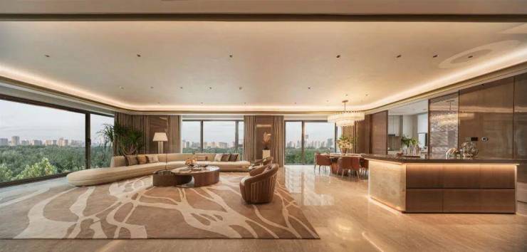 另一款是L型转角边厅,餐客厅接近90㎡,双面都向着小区中央花园打开,仿佛一只悬浮在苍翠园林之上的玻璃匣子。