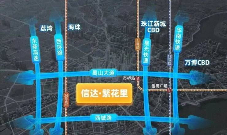 周边有禺山大道、西环路,通达全城,接驳东新高速快速畅达荔湾海珠,也可接驳新光快速畅达万博CBD、珠江新城CBD,自驾出行方便