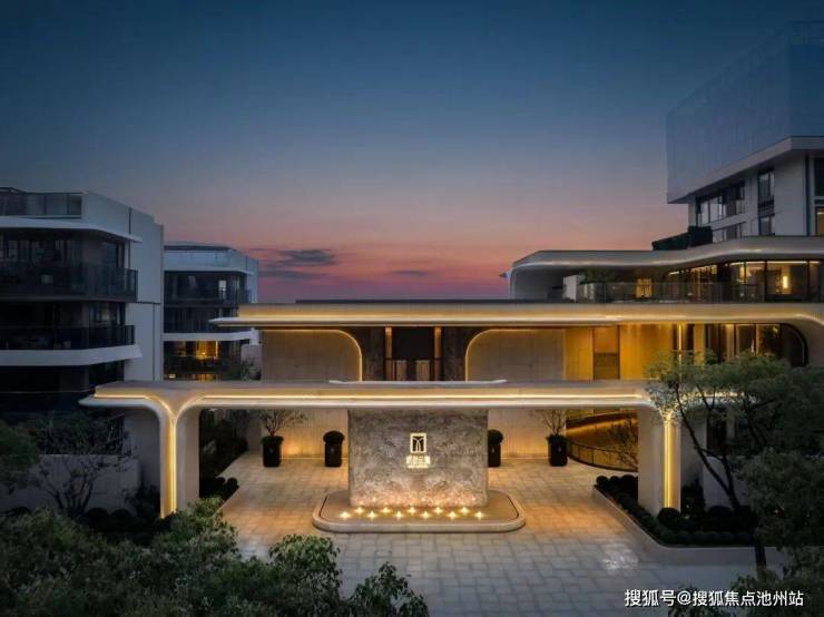 约13米高建筑飞瀑,潺潺流水与玻璃幕墙形成虚实交织的视觉焦点;叠水景观、空中连廊、休憩亭台层层递进,构建出“移步异景”的立体游园动线。近8.5米社区门头对标顶奢酒店尺度,通过石材与金属的碰撞,让归家成为一场非凡的度假旅行。