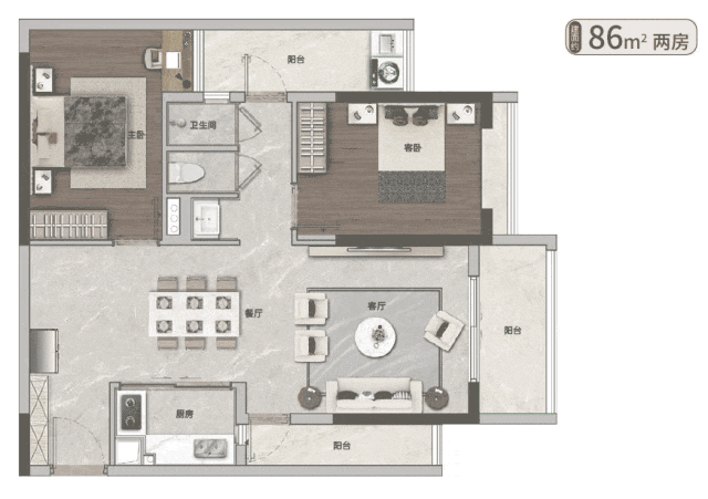 建面约86㎡两房,更是突破性地打造了越秀唯一两房可以做三阳台户型。